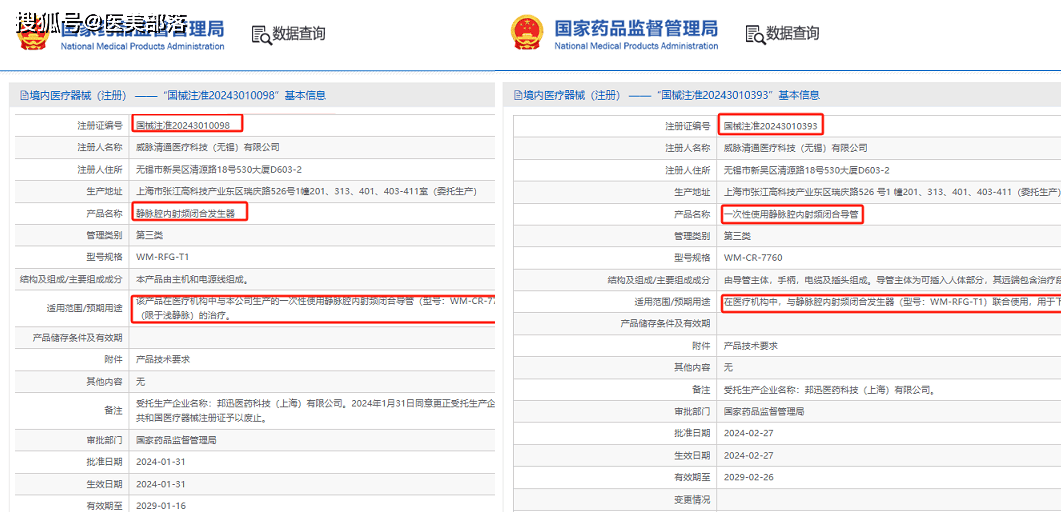 2024年1月31日,威脉医疗注册的“静脉腔内射频闭合发生器”WM-RFG-T1正式获批,注册证号:国械注准20243010098;2024年2月27日,威脉医疗注册的“一次性使用静脉腔内射频闭合导管“WM-CR-7760正式获批,注册证号:国械注准20243010393,两款产品配合使用,主要用于下肢大隐静脉曲张(限于浅静脉)的治疗。