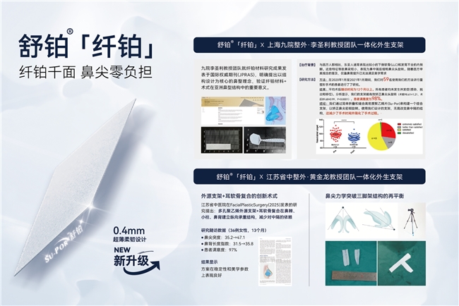 针对鼻整形医生对“支撑力”与“自然感”的双重苛求,舒铂重点展示了核心材料——纤铂高定®。该材料凭借超轻薄、高柔韧及极佳的组织贴合度,有效改善了传统材料在鼻尖表现点塑造上的生硬感。它不仅能提供稳固的结构支撑,更能助力医生实现鼻部亚单位的精细化雕琢,让术后效果兼具即刻形态的稳定与长期的动态自然。